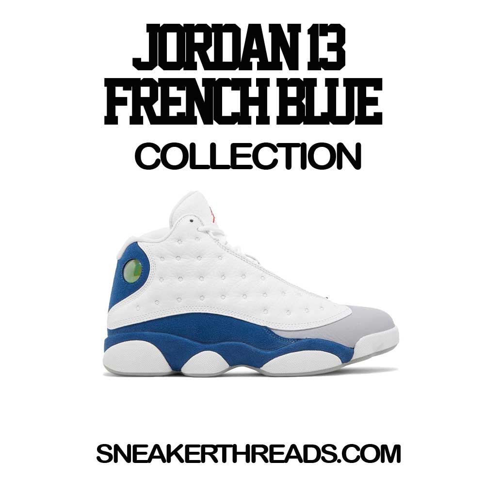 Shirt to matches Jordan 13 french blue sneakers | Sneaker tees outfit.