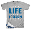 Shirt to matches Jordan 13 french blue sneakers | Sneaker tees outfit.