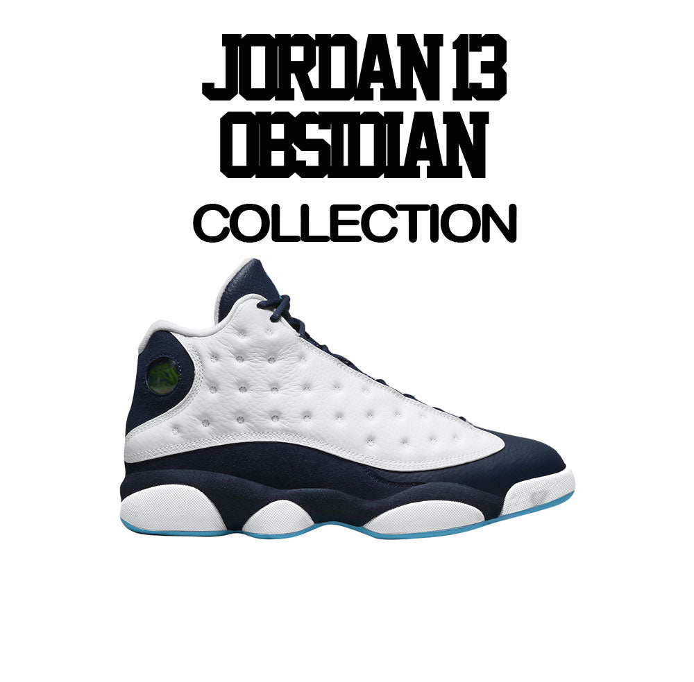Sweater matches Jordan 13 obsidian sneaker colorway.