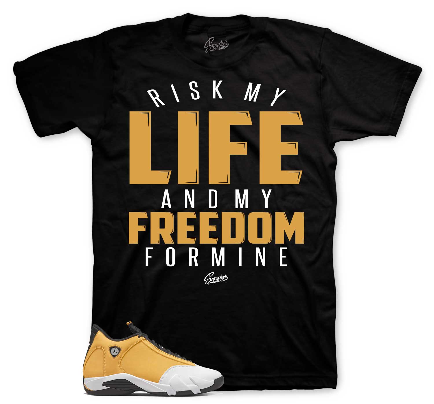 Sneaker shirts match Jordan 14 light ginger sneaker colorway.