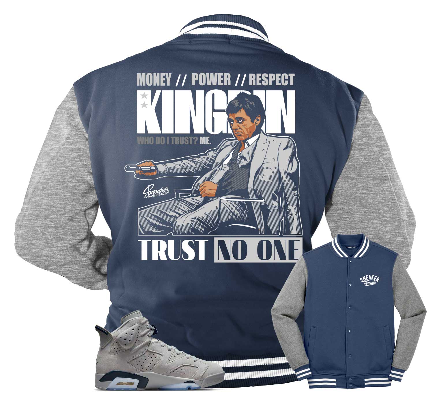 Sneaker varsity jackets match Jordan 6 Georgetown navy shoes